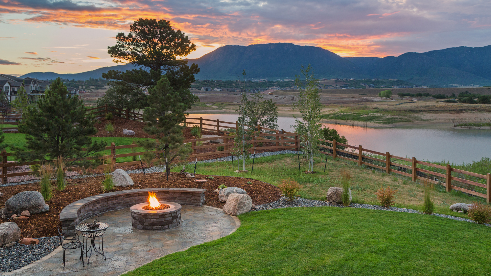 Chic relaxation: Backyard cleanup with blue chairs and a stone fire pit.